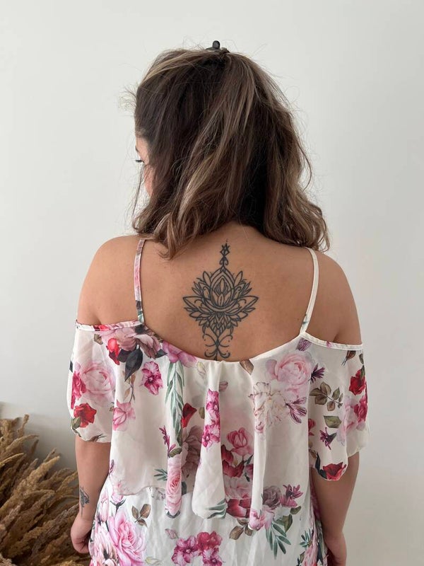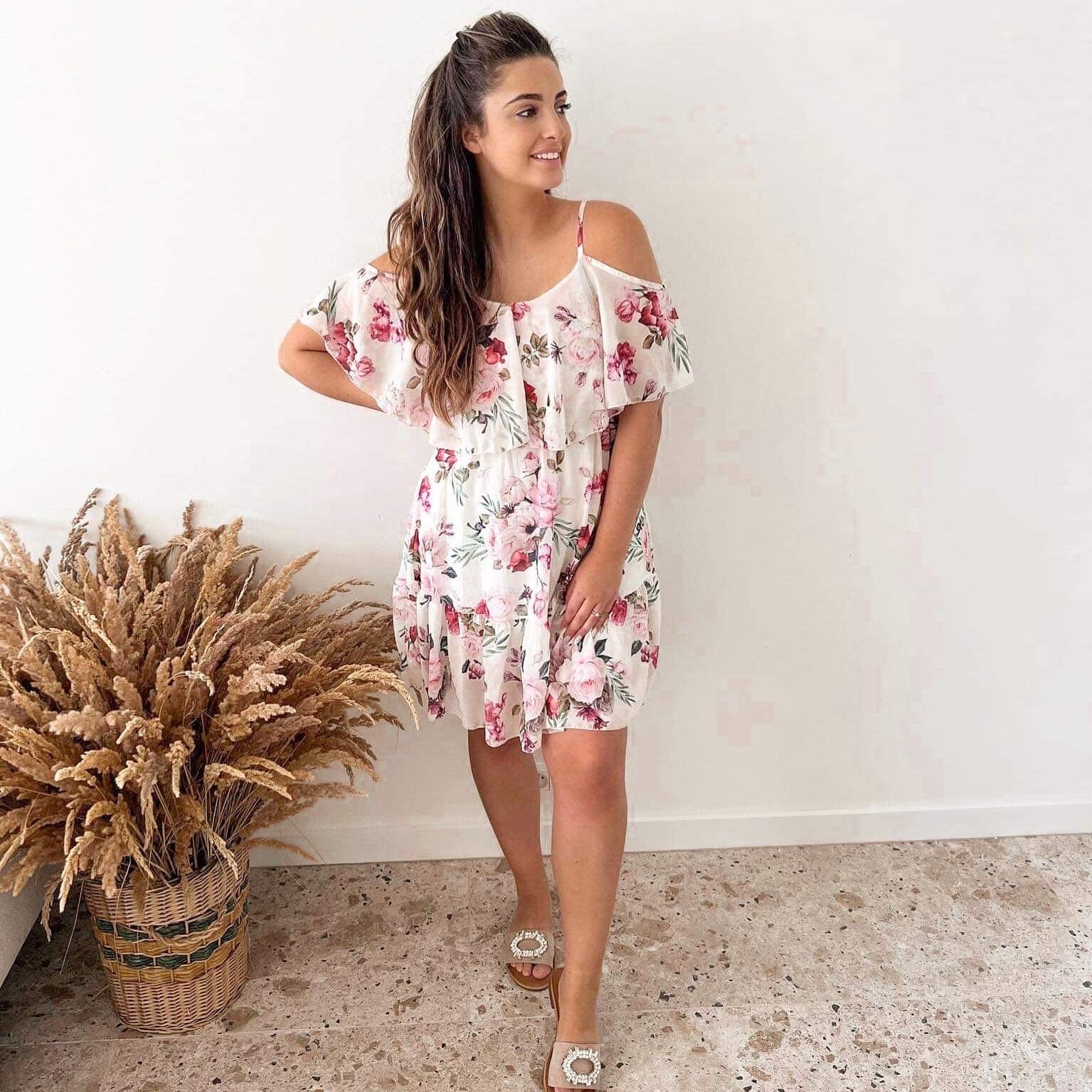 Jurk van gebloemde stof, op schouderbandjes met korte mouwen. Jurk in een uitlopende snit met een franje. Ideaal voor vele gelegenheden.